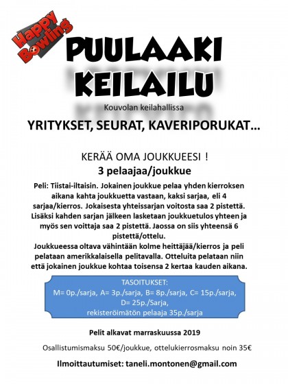 Yritysten, seurojen ja kaveriporukoiden puulaaki alkaa Kouvolan keilahallilla marraskuussa. Kerää oma joukkueesi ja ilmoittaudu mukaan! Luvassa rentoa keilailua kilpailuhenkisellä mausteella.