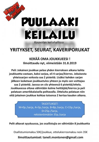 Yritysten, seurojen ja kaveriporukoiden Puulaakikeilailu alkaa syksyllä Kouvolan keilahallissa. Kerää kokoon vähintään kolmen hengen joukkue ja ilmoittaudu sarjaan 31.8.2019 mennessä. Pelit alkavat syyskuussa, mikäli ilmoittautuneita joukkueita on vähintään kahdeksan.