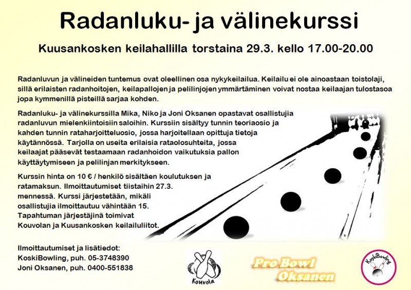 Radanluku- ja välinekurssi Kuusankosken keilahallilla torstaina 29.3. kello 17.00-20.00.