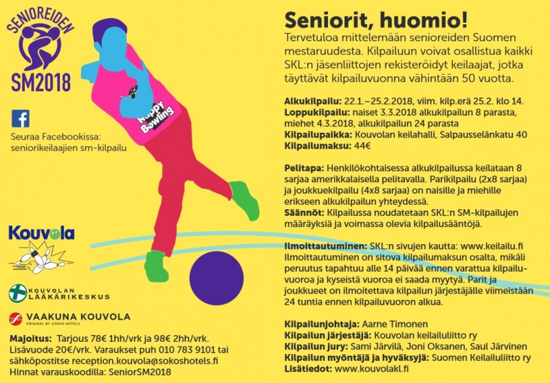 Senioreiden SM-kilpailujen valvojien koulutustilaisuus 17.1.2018 kello 17.00-19.00 Kouvolan keilahallin kabinettitiloissa.