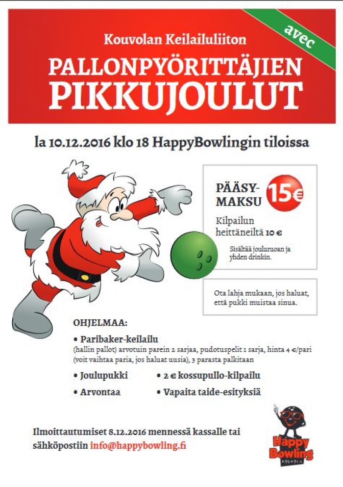 Kouvolan keilahallin pikkujoulut lauanataina 10.12 kello 18.00 alkaen. Ilmoittautumiset 8.12. mennessä keilahallin kassalle tai sähköpostitse. Kaikki mukaan!