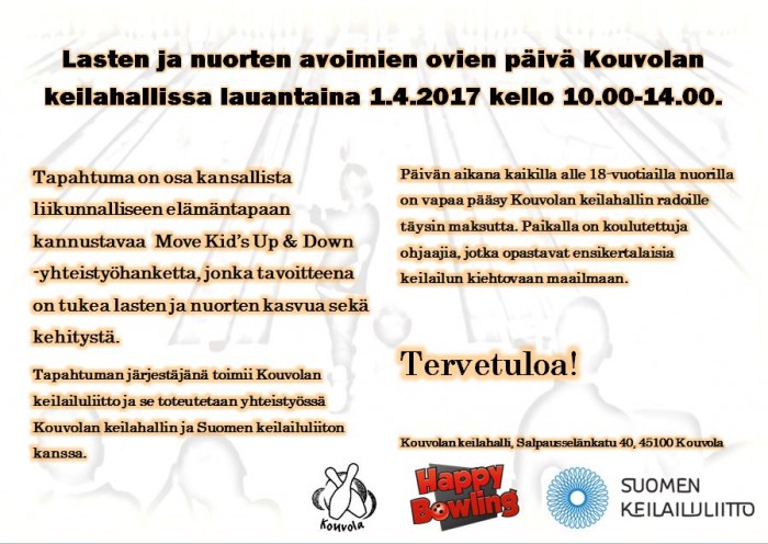 Päivän aikana kaikilla alle 18-vuotiailla nuorilla on vapaa pääsy Kouvolan keilahallin radoille täysin maksutta. Paikalla on koulutettuja ohjaajia, jotka opastavat ensikertalaisia keilailun kiehtovaan maailmaan.