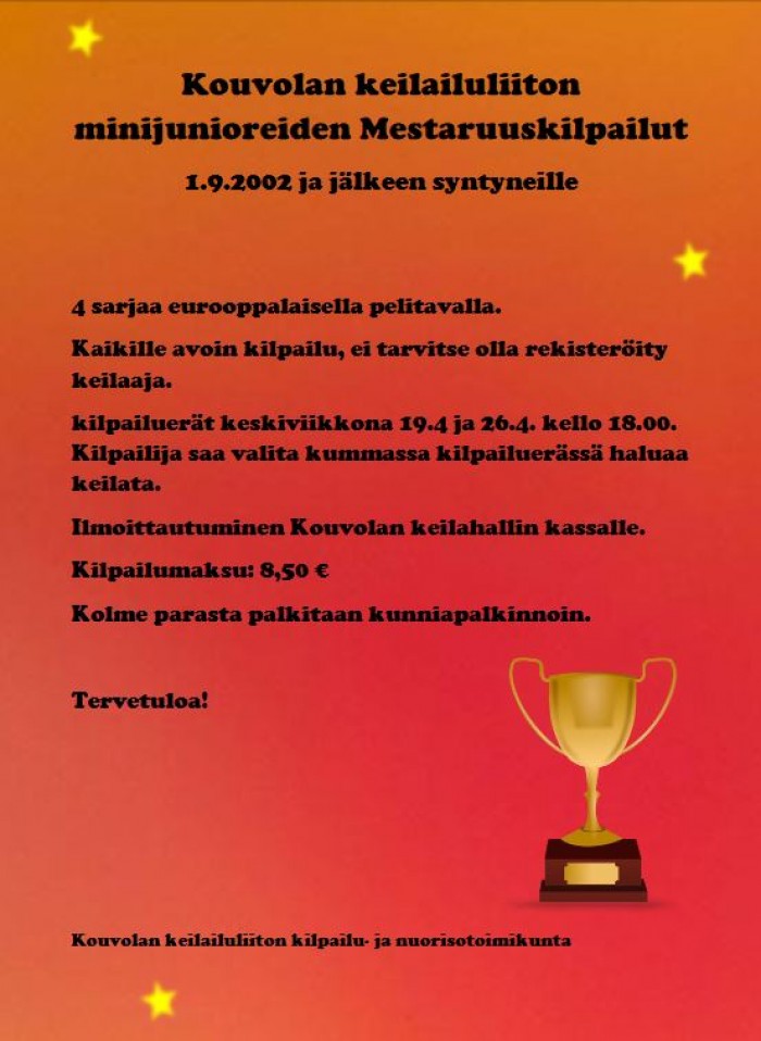 Ilmoittautuminen Kouvolan keilahallin kassalle. Kysy lisää junioriharjoituksissa!