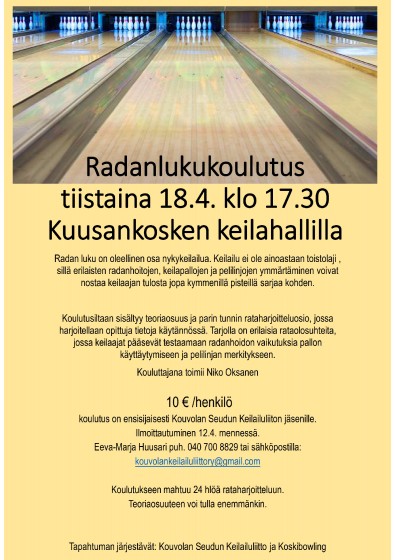 Kouvolan Seudun Keilailuliito ja KoskiBowling järjestävät Kuusankosken keilahallilla radanlukukoulutuksen tiistaina 18.4. kello 17.30 alkaen. Koulutus sisältää teoria- ja rataharjoitteluosuudet. Tarjolla on erilaisia rataolosuhteita, jossa keilaajat pääsevät testaamaan radanhoidon vaikutuksia pallon käyttäytymiseen ja pelilinjan merkitykseen. Kouluttajana toimii Niko Oksanen.