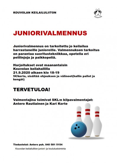 Kouvolan Keilailuliitto aloittaa uuden juniorivalmennusvuoron Kouvolan keilahallilla maanantaisin kello 18.00-19.00. Valmennusvuoro alkaa 21.9.2020. Juniorivalmennus on tarkoitettu jo keilailua harrastaneille junioreille. Valmennuksen tarkoitus on parantaa suoritustekniikkaa, opetella eri pelilinjoja ja paikkopeliä.