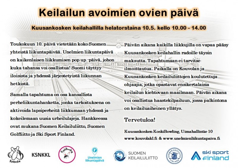 Keilailun avoimien ovien päivä Kuusankosken keilahallilla helatorstaina 10.5. kello 10.00-14.00.