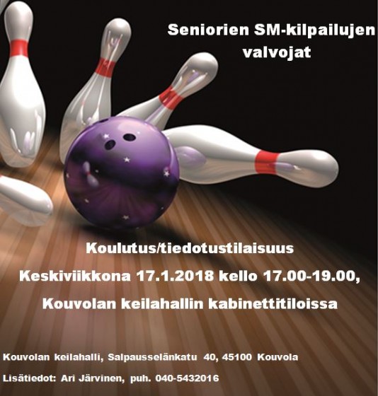 Senioreiden SM-kilpailujen valvojien koulutustilaisuus 17.1.2018 kello 17.00-19.00 Kouvolan keilahallin kabinettitiloissa.