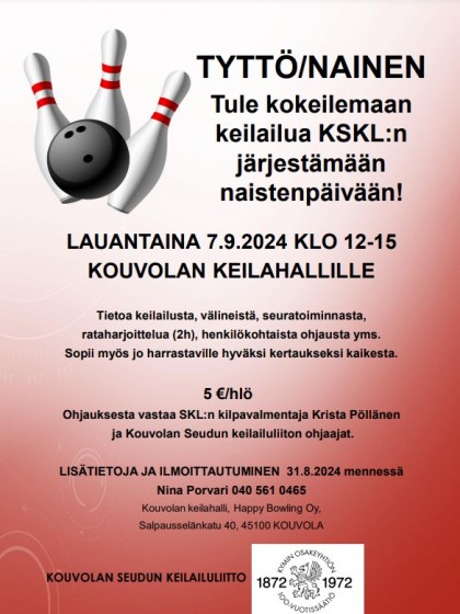 Kouvolan Seudun Keilailuliitto järjestää Naistenpäivän Kouvolan keilahallilla 7.9.2024 kello 12.00-15.00. Tarjolla on tietoa keilailusta, välineistä, seuratoiminnasta, rataharjoittelua (2 h) ja henkilökohtaista ohjausta.