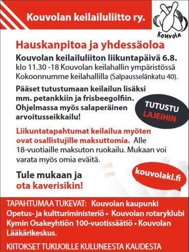 Kouvolan keilailuliitto järjestää lauantaina 6. elokuuta kaikille avoimen liikuntapäivän Kouvolan Urheilupuiston ympäristössä. Tapahtumassa pidetään hauskaa monen eri urheilulajin parissa ja nautitaan yhdessä liikunnan riemusta. Päivän aikana pääsee keilailun lisäksi tutustumaan mm. petankkiin ja frisbeegolfiin. Ohjelmassa on myös salaperäinen arvoitusseikkailu! Päivän aikana on tarjolla ruokailua, mutta mukaan voi varata myös omia eväitä.